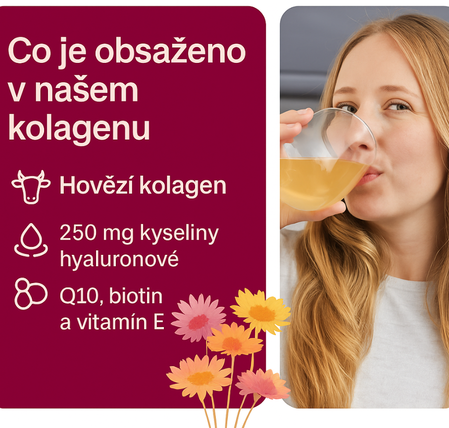 Doplněk stravy v prášku s hydrolyzovaným hovězím kolagenem, kyselinou hyaluronovou, koenzymem Q10, vitaminy a minerálními látkami. Příchuť malina, slazeno stévií, s velmi nízkým obsahem cukru.